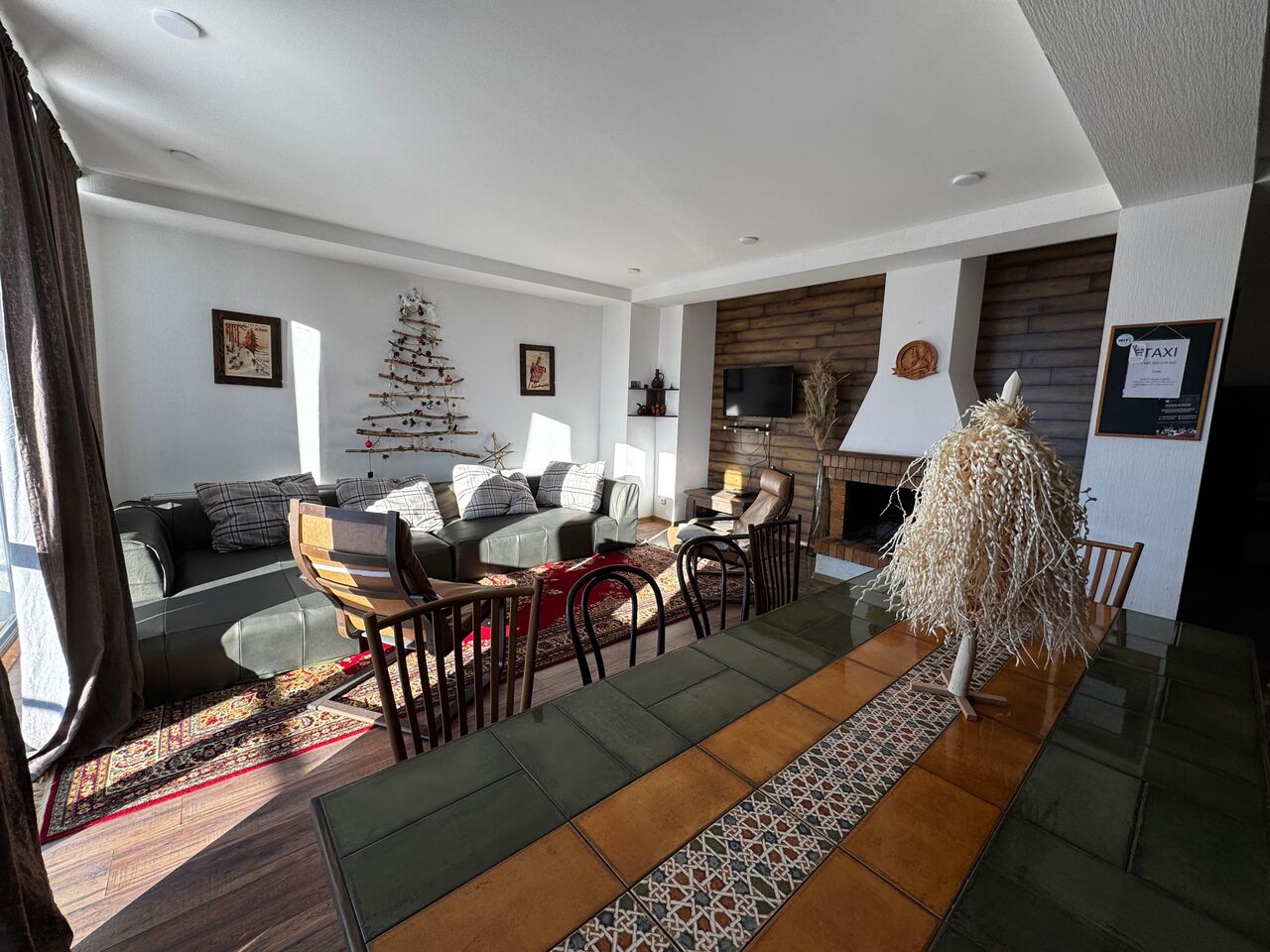 Гостиная с КАМИНОМ, кухня cо всем необходимым: плита, чайник, посудомоечная машина, тостер, кофемашина, микроволновая печь. Постельное белье, полотенца, телевизор; ДВД плеер; спутник; фен, балкон и тп . Для 10 человек.