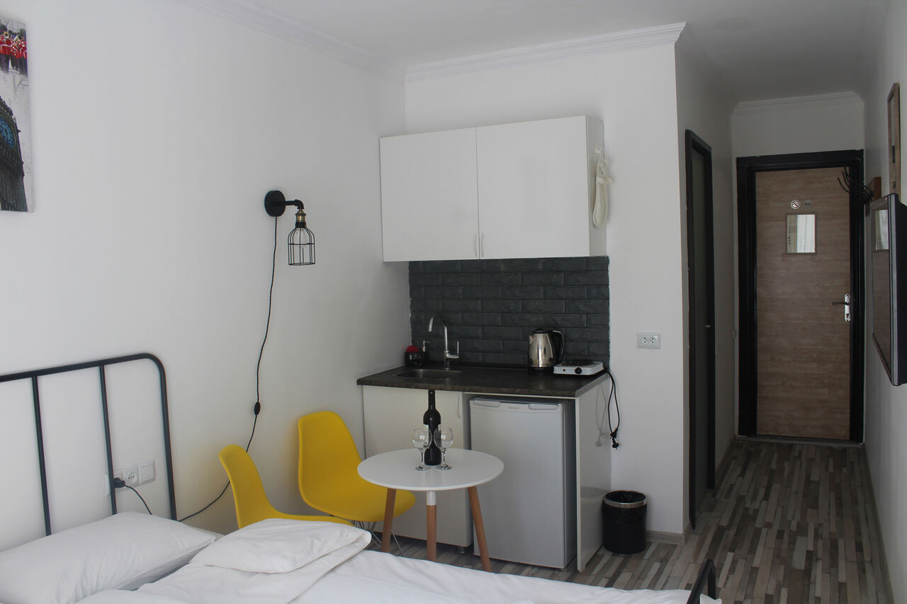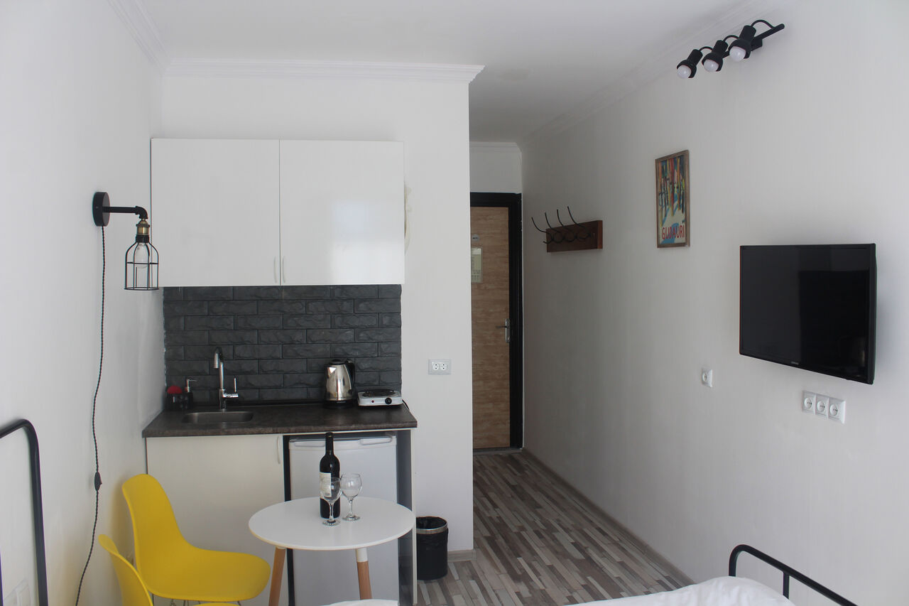 Номера: Сдается однокомнатный уютный номер на два человека. В номере постоянно идет холодная и горячая вода, отопление, сан-узел, душ, плазменны телевизор, встроенная угловая кухня со всеми принадлежностями, холодильник, бесплатный интернет WIFI. С болкона номера открывается потрясающий вид на горы и лыжную трассую.