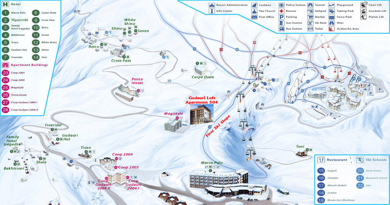 Месторасположение: Добро пожаловать на горнолыжном курорте Гудаури в новом апарт-отеле „Gudauri Loft” , рядом c первой лыжной трассы первой очереди на 2100м, над уровнем моря.